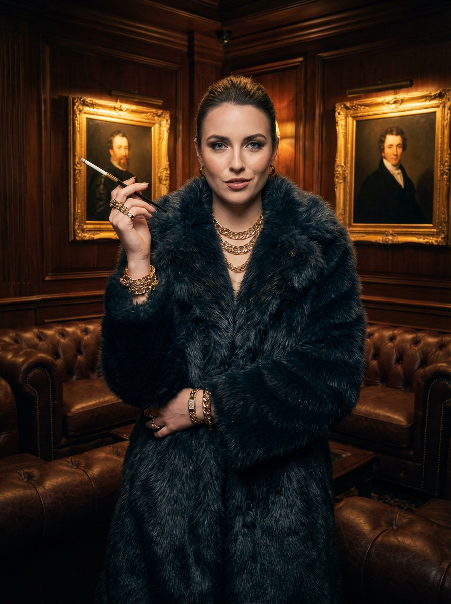 beautiful model as a mobster, mafia, mafia outfit, faux fur coats, chunky gold jewelry, mafia aesthetic, flashy, glamorous, luxury, loud, Goodfellas, The Sopranos, Mob Wives, opulence, confidence