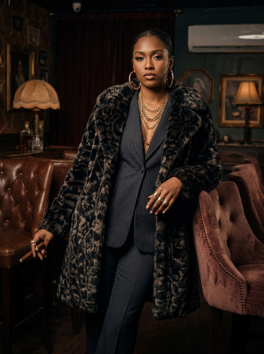 beautiful model as a mobster, mafia, mafia outfit, faux fur coats, chunky gold jewelry, mafia aesthetic, flashy, glamorous, luxury, loud, Goodfellas, The Sopranos, Mob Wives, opulence, confidence