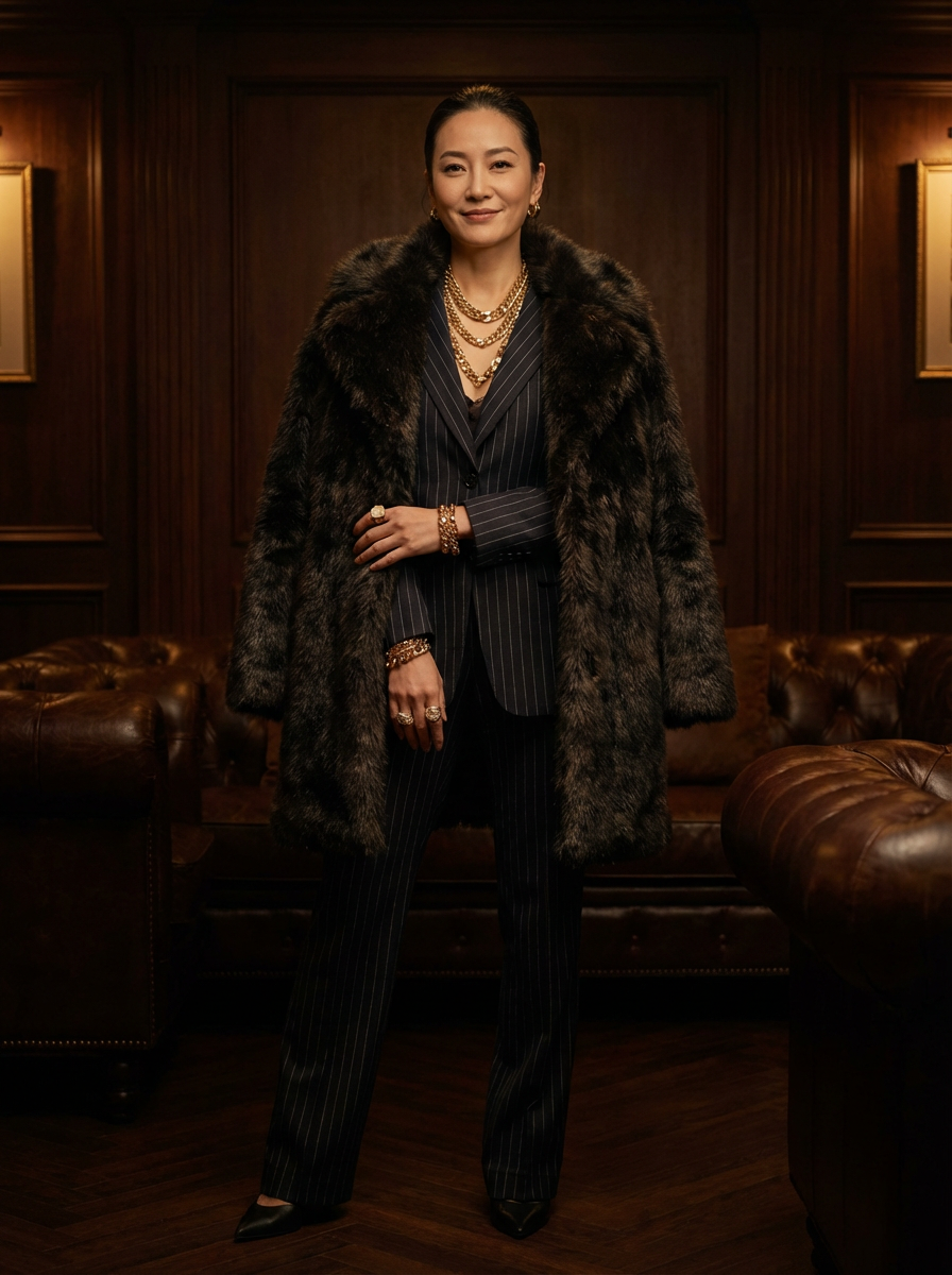 beautiful model as a mobster, mafia, mafia outfit, faux fur coats, chunky gold jewelry, mafia aesthetic, flashy, glamorous, luxury, loud, Goodfellas, The Sopranos, Mob Wives, opulence, confidence