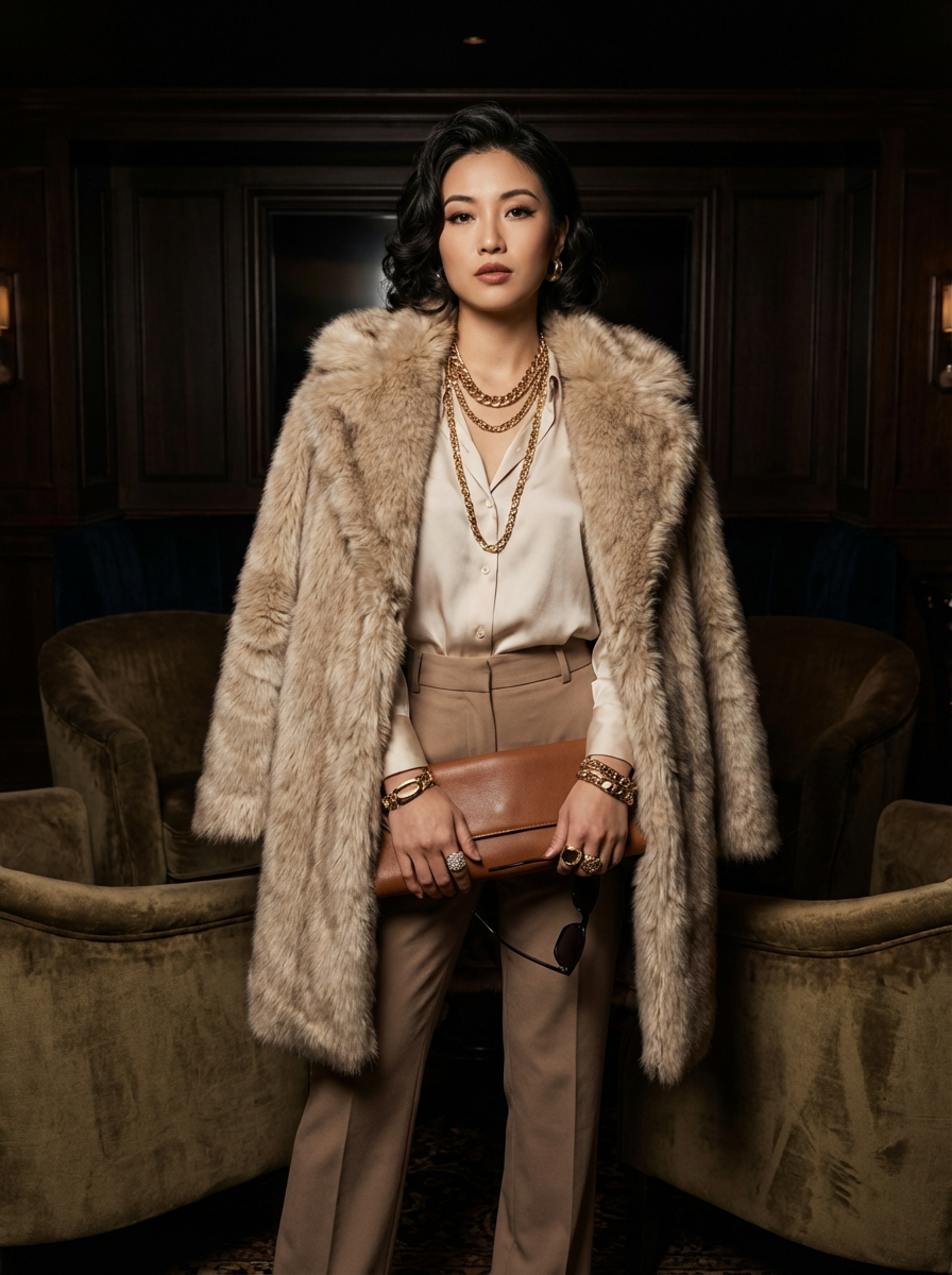 beautiful model as a mobster, mafia, mafia outfit, faux fur coats, chunky gold jewelry, mafia aesthetic, flashy, glamorous, luxury, loud, Goodfellas, The Sopranos, Mob Wives, opulence, confidence