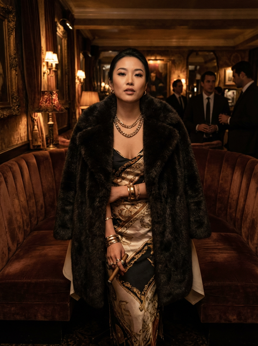 beautiful model as a mobster, mafia, mafia outfit, faux fur coats, chunky gold jewelry, mafia aesthetic, flashy, glamorous, luxury, loud, Goodfellas, The Sopranos, Mob Wives, opulence, confidence