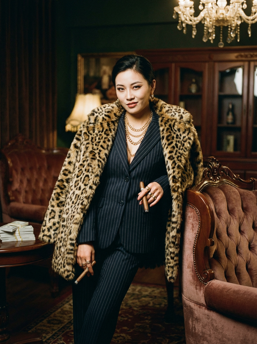 beautiful model as a mobster, mafia, mafia outfit, faux fur coats, chunky gold jewelry, mafia aesthetic, flashy, glamorous, luxury, loud, Goodfellas, The Sopranos, Mob Wives, opulence, confidence