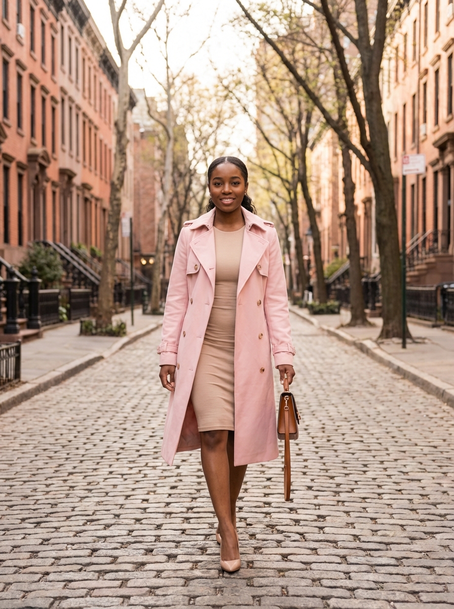 beautiful model wearing a pastel pink tailored trench coat over a form-fitting dress, walking confidently in a city street, soft natural daylight, dreamy tones, elegant street fashion photography