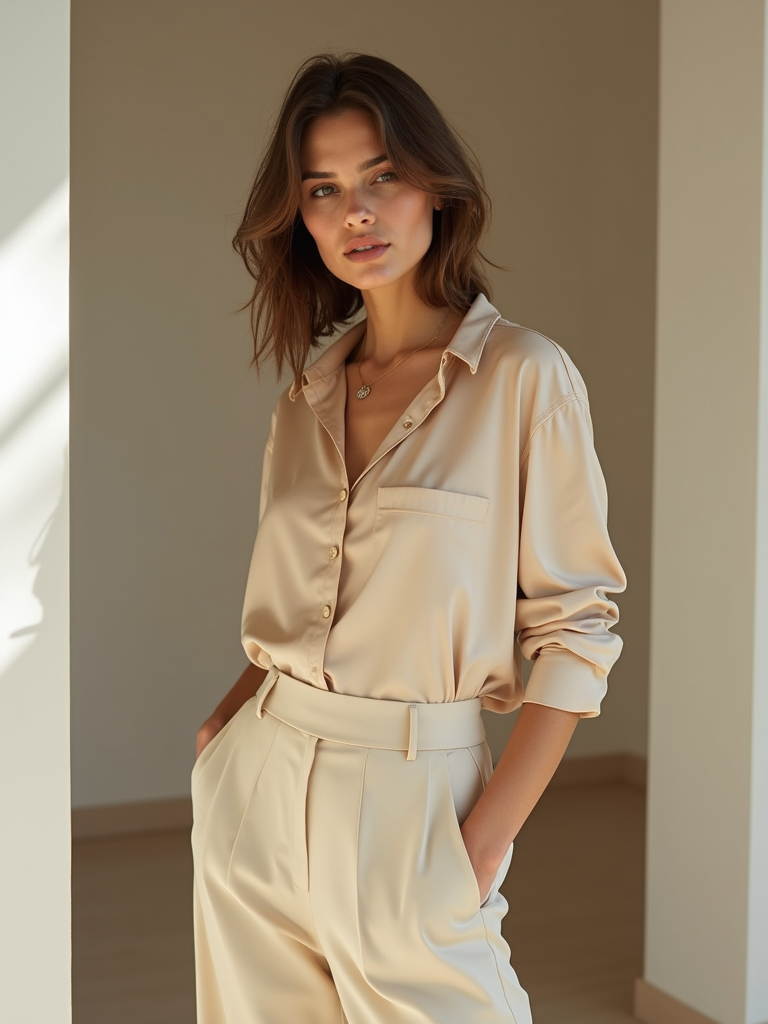 beautiful model wearing nude-colored silk blouse and matching trousers, posing indoors with soft indirect light, minimalist luxury fashion look
