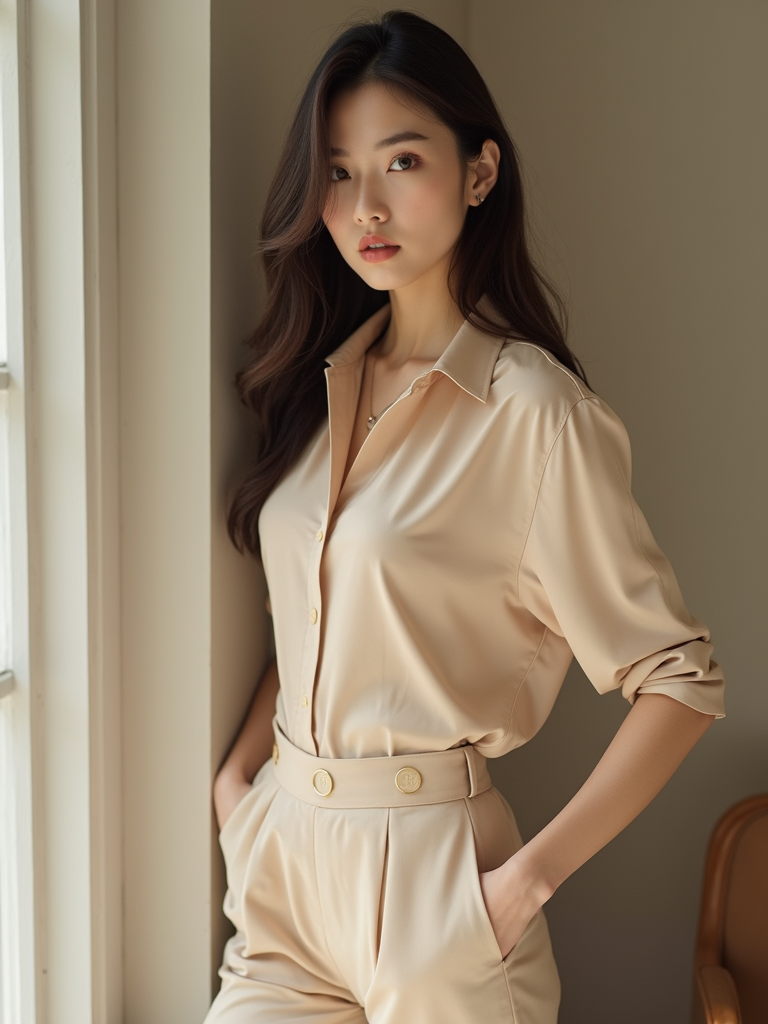 beautiful model wearing nude-colored silk blouse and matching trousers, posing indoors with soft indirect light, minimalist luxury fashion look
