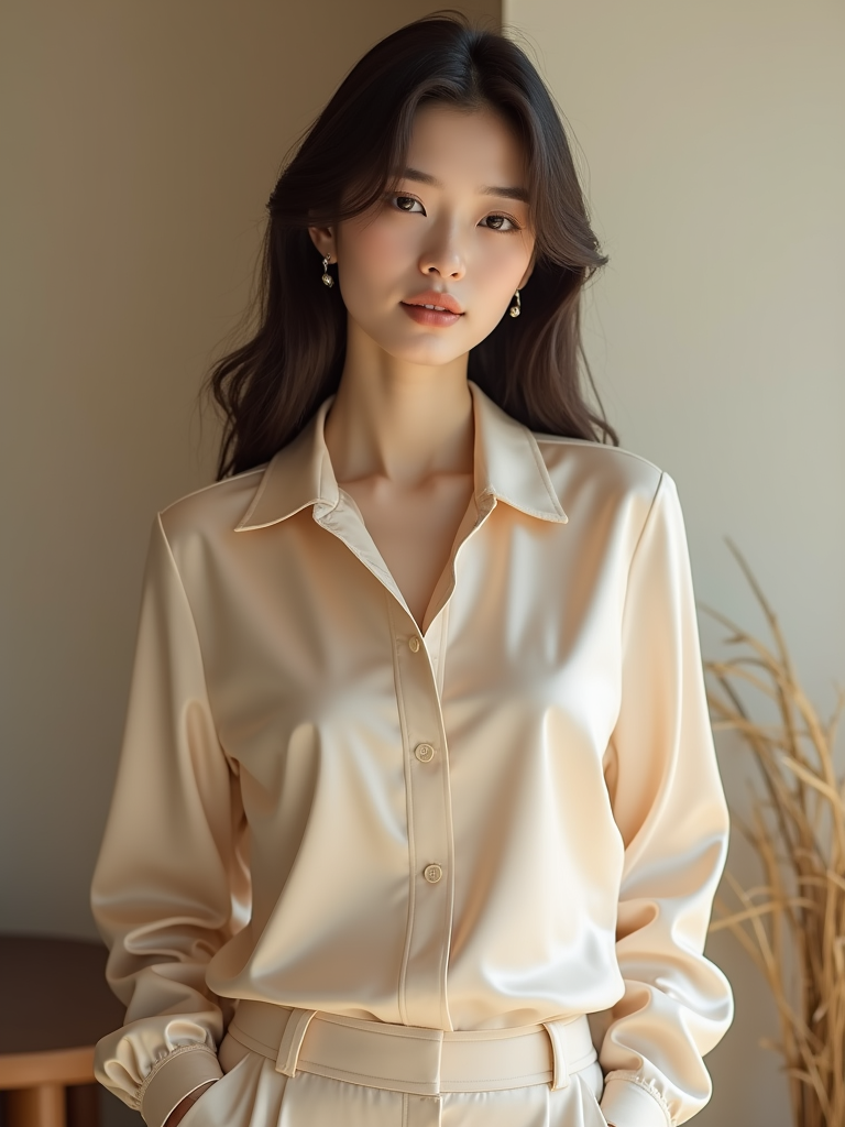 beautiful model wearing nude-colored silk blouse and matching trousers, posing indoors with soft indirect light, minimalist luxury fashion look