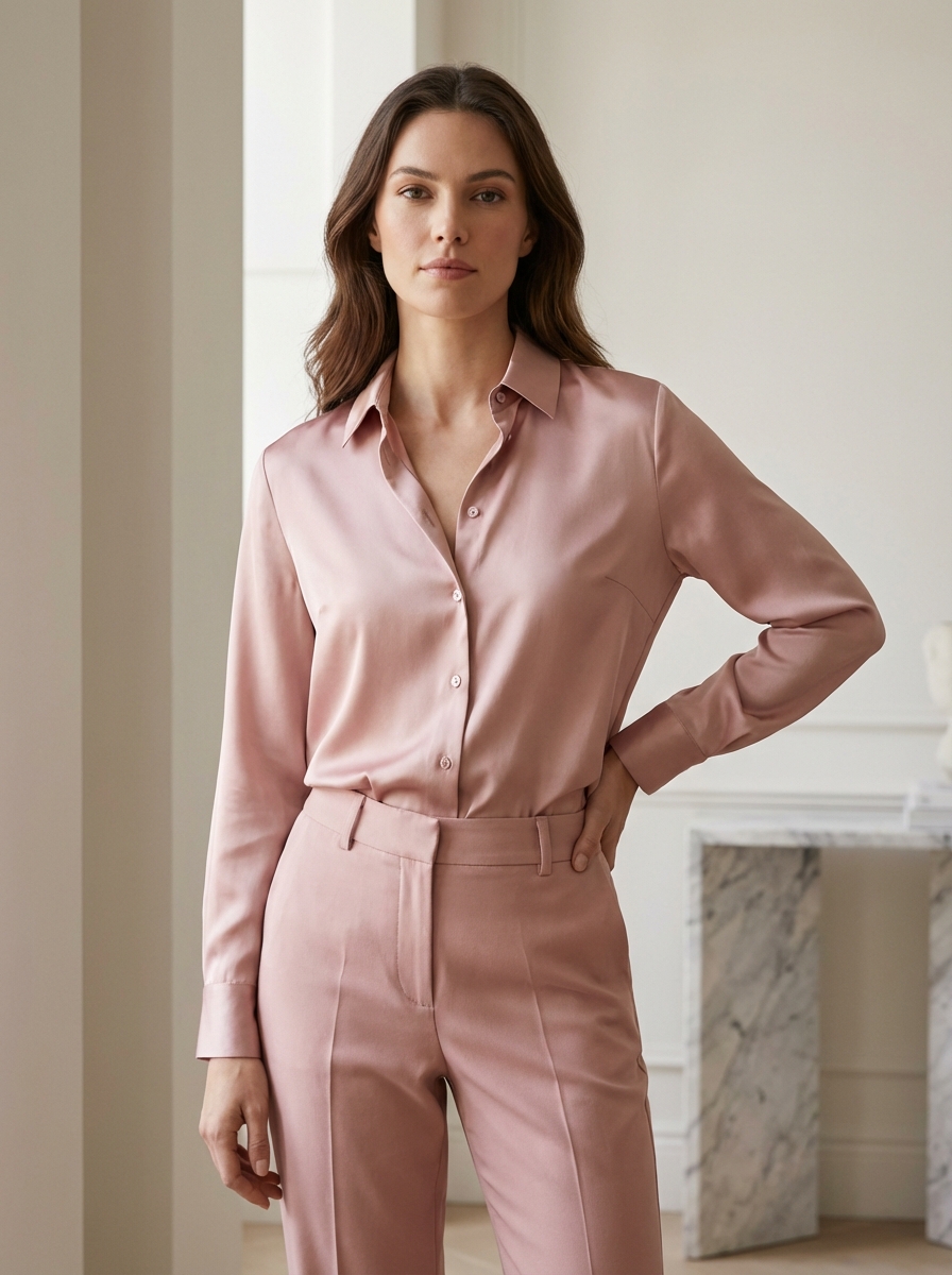 beautiful model wearing pastel rose silk blouse and matching trousers, posing indoors with soft indirect light, minimalist luxury fashion look