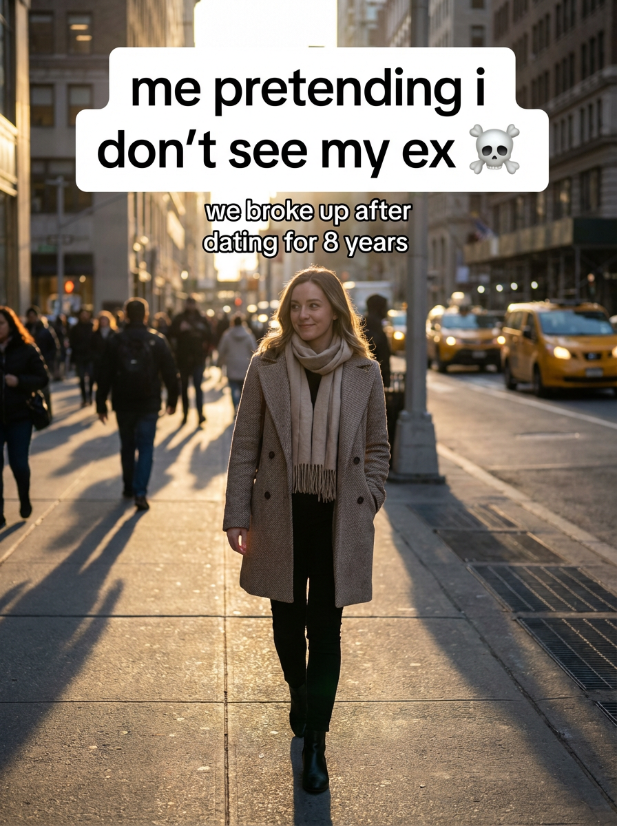 beautiful model with shy expression walking in New York, cinematic lighting, overlay TikTok-style text captions in bold white text with black outline "me pretending i don't see my ex ☠️" and smaller text below (we broke up after dating for 8 years)