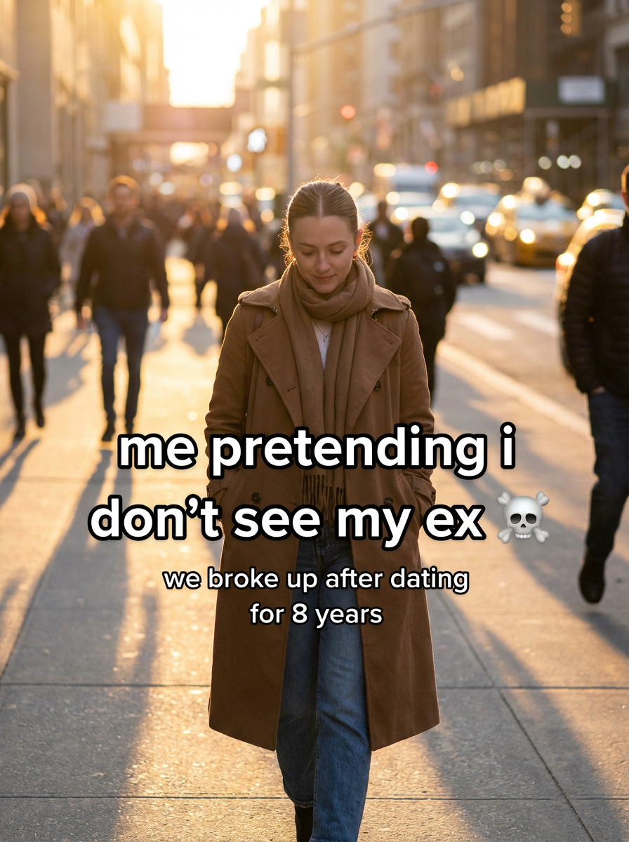 beautiful model with shy expression walking in New York, cinematic lighting, overlay TikTok-style text captions in bold white text with black outline "me pretending i don't see my ex ☠️" and smaller text below (we broke up after dating for 8 years)