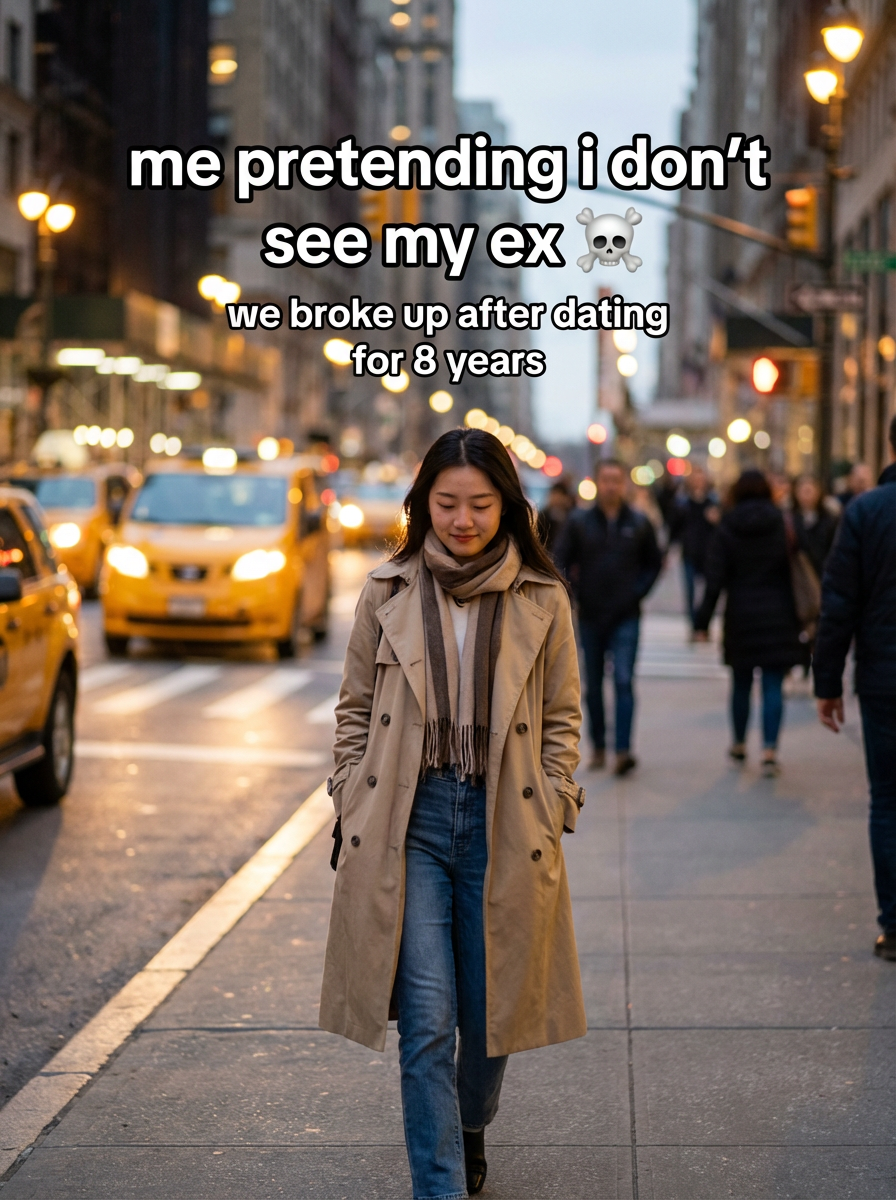 beautiful model with shy expression walking in New York, cinematic lighting, overlay TikTok-style text captions in bold white text with black outline "me pretending i don't see my ex ☠️" and smaller text below (we broke up after dating for 8 years)
