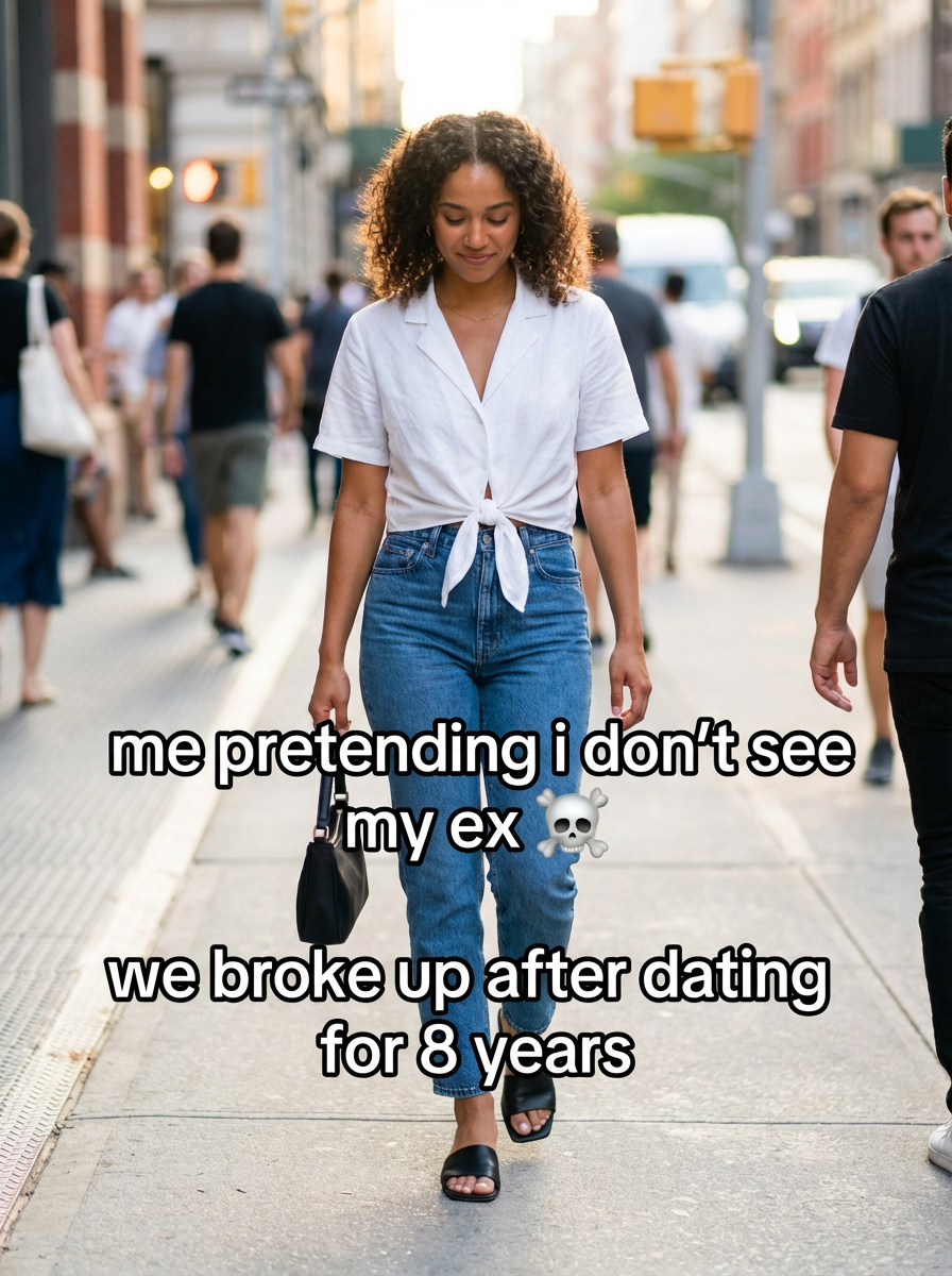 beautiful model with shy expression walking in New York, cinematic lighting, overlay TikTok-style text captions in bold white text with black outline "me pretending i don't see my ex ☠️" and smaller text below (we broke up after dating for 8 years)