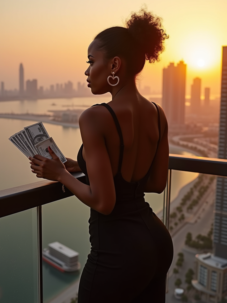 beautiful model model counting stacks of cash on a penthouse balcony overlooking Dubai skyline at sunset