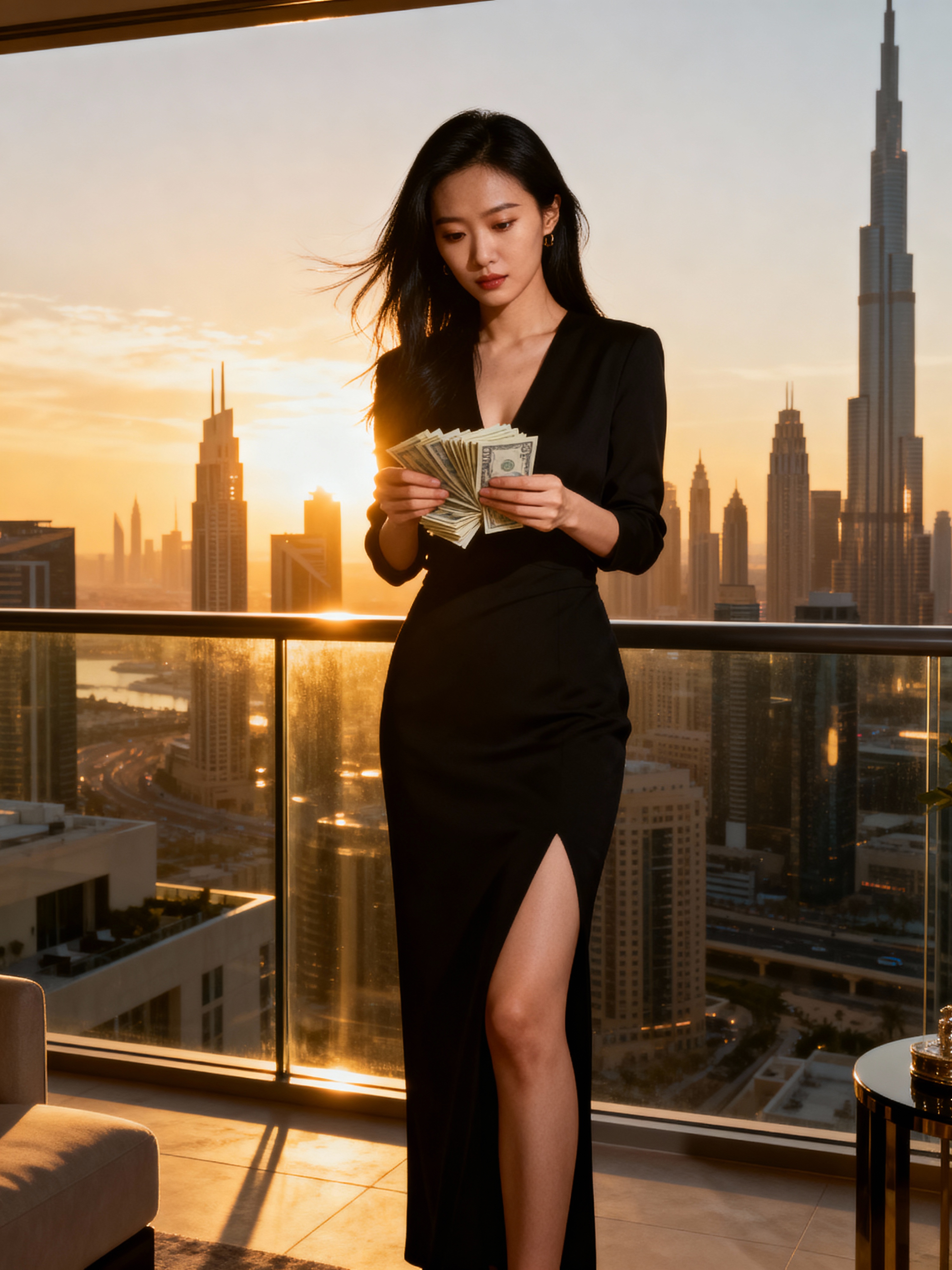 beautiful model model counting stacks of cash on a penthouse balcony overlooking Dubai skyline at sunset