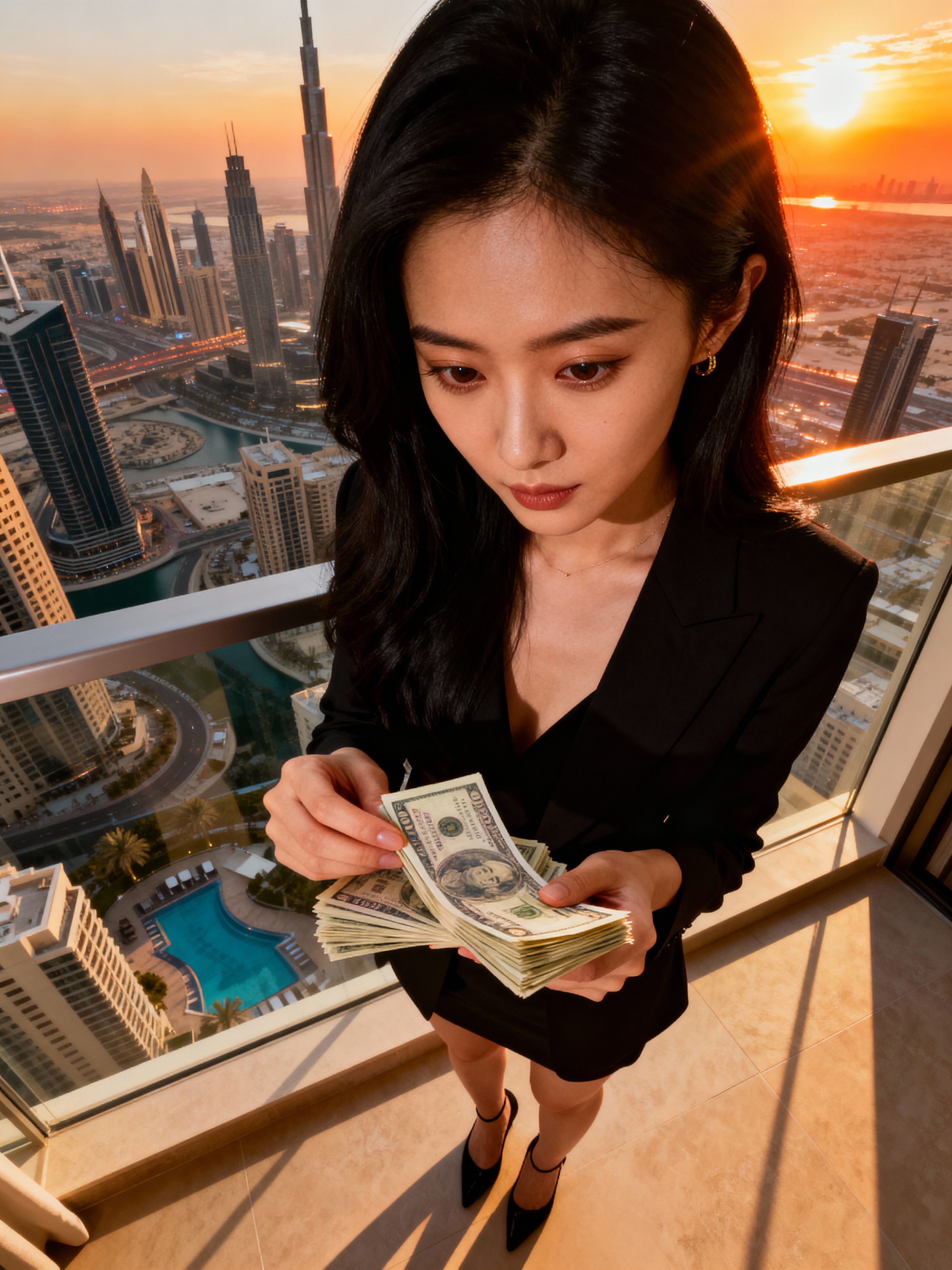 beautiful model model counting stacks of cash on a penthouse balcony overlooking Dubai skyline at sunset