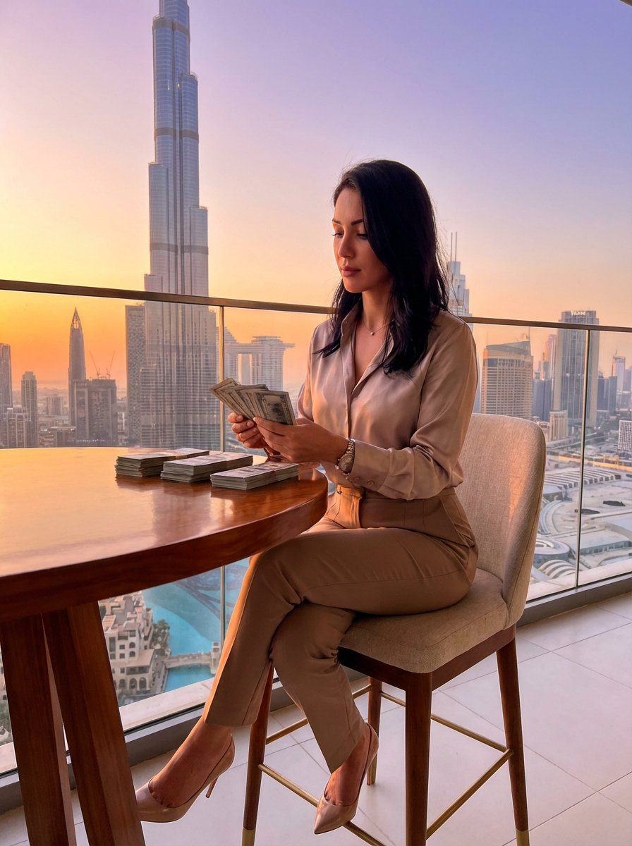 beautiful model model counting stacks of cash on a penthouse balcony overlooking Dubai skyline at sunset