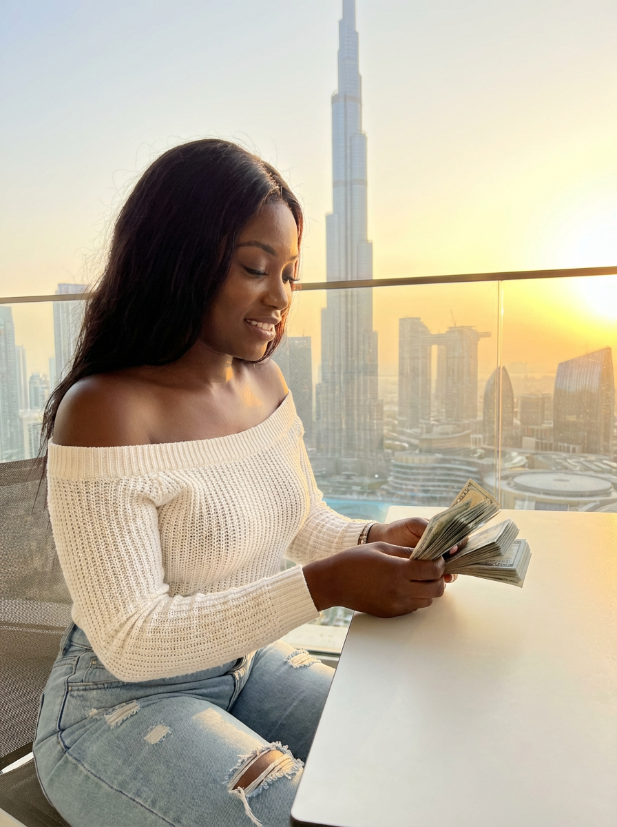 beautiful model model counting stacks of cash on a penthouse balcony overlooking Dubai skyline at sunset