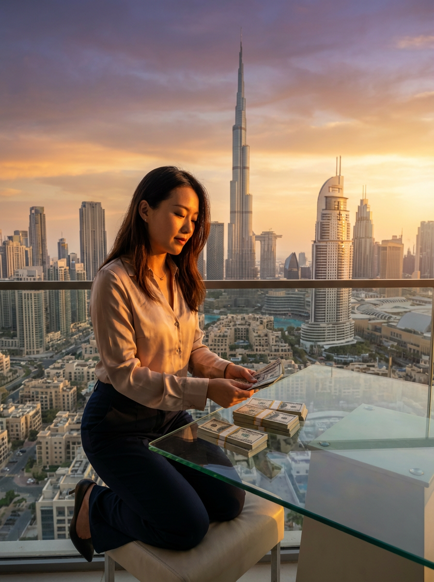 beautiful model model counting stacks of cash on a penthouse balcony overlooking Dubai skyline at sunset