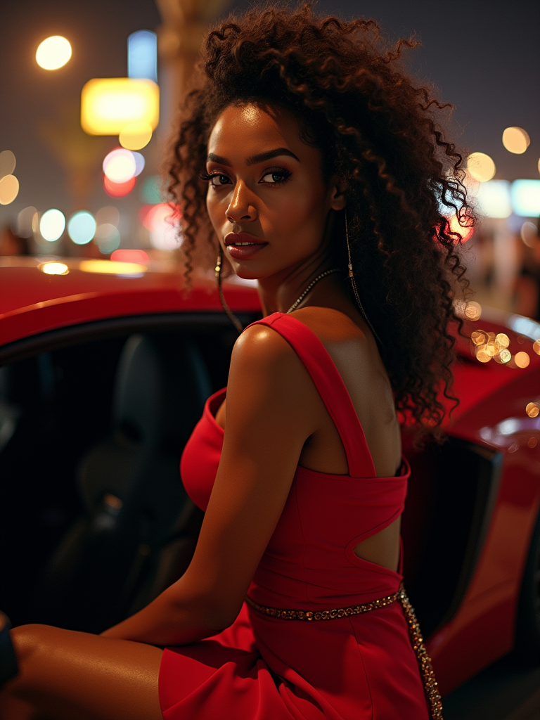 beautiful model model getting out of a Lamborghini at night in front of a Dubai nightclub, paparazzi flashing