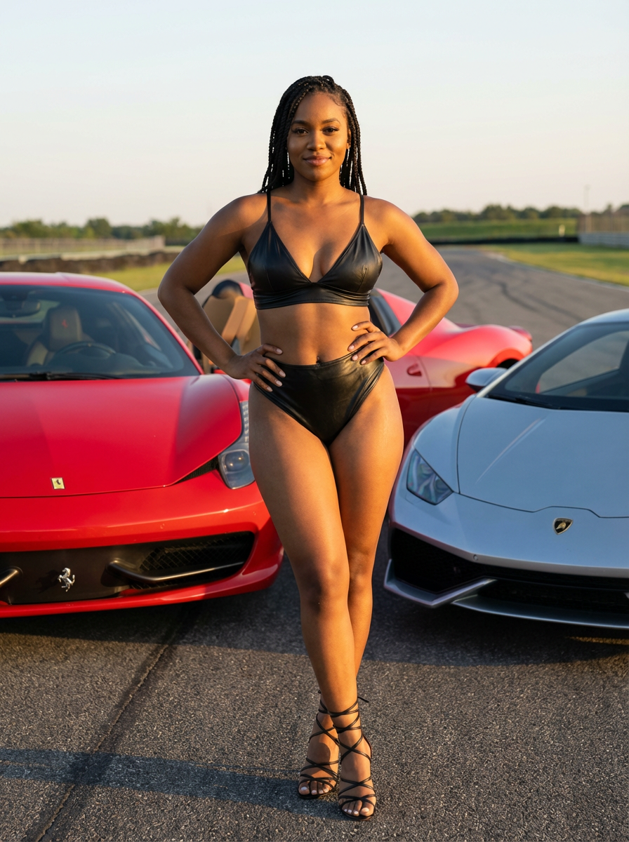beautiful model model in black leather Bikini and heels posing in front of sports cars