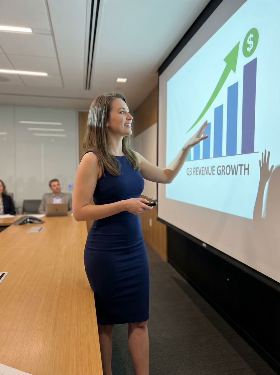 beautiful model model in tight fitting bodycon dress doing a presentation showing a chart of money going up