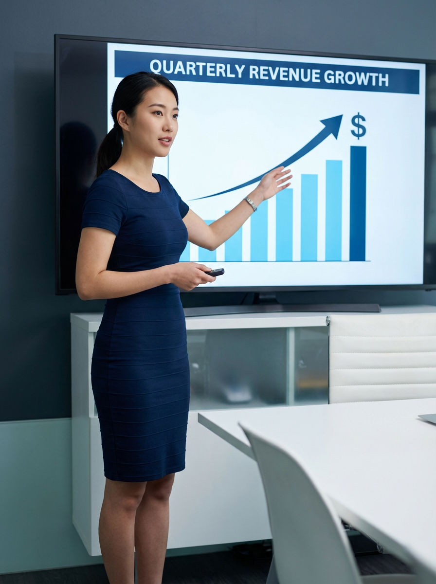 beautiful model model in tight fitting bodycon dress doing a presentation showing a chart of money going up