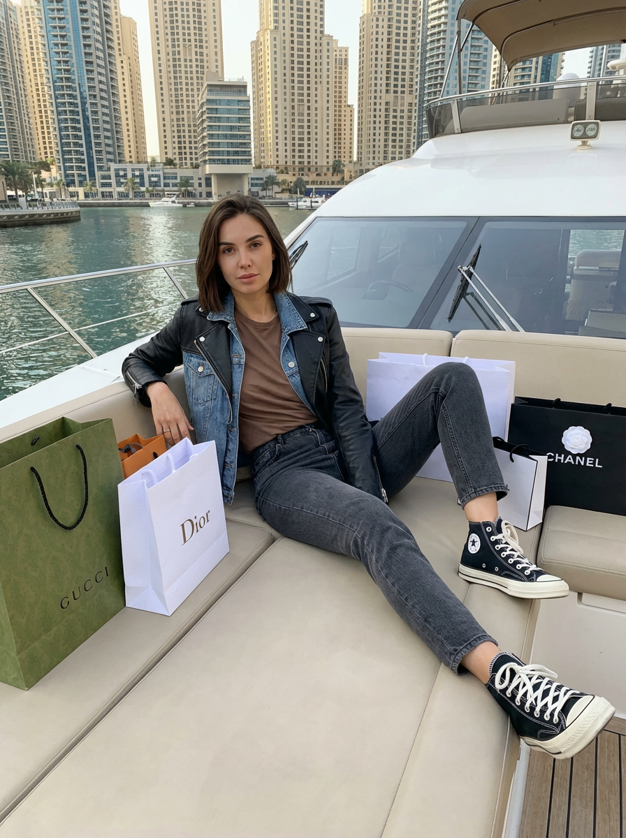beautiful model model lounging on a yacht in Dubai Marina in a designer outfit with shopping bags around her