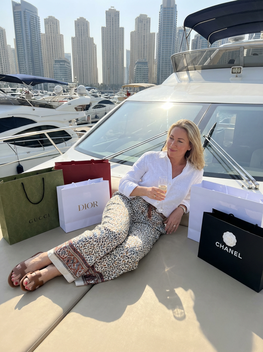 beautiful model model lounging on a yacht in Dubai Marina in a designer outfit with shopping bags around her