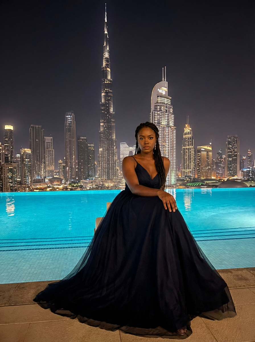 beautiful model model sitting by an infinity pool at night in Dubai, city lights in the background, looking powerful