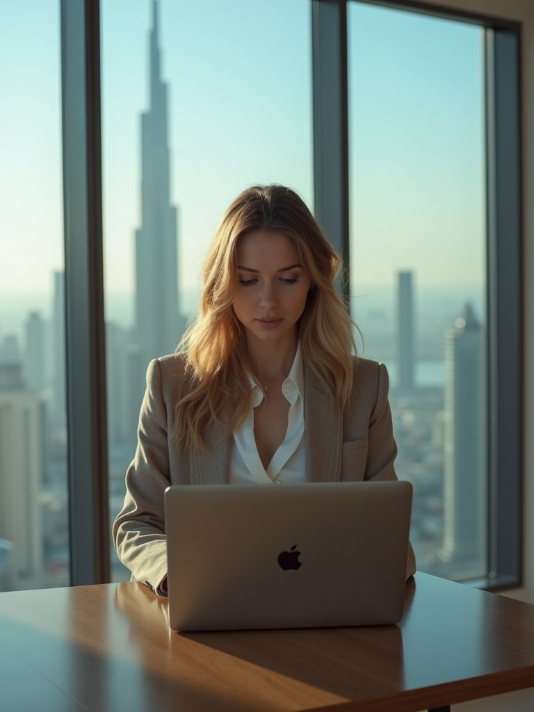 beautiful model model trading crypto on a laptop in a skyscraper office overlooking Dubai, wearing smart casual outfit