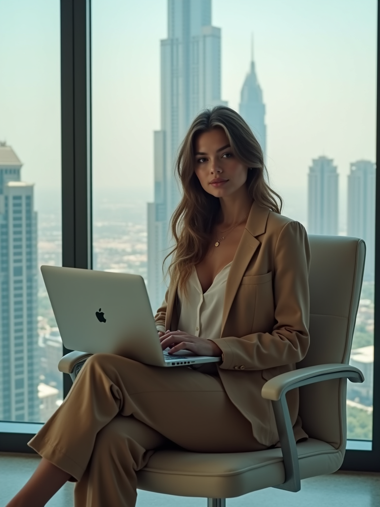 beautiful model model trading crypto on a laptop in a skyscraper office overlooking Dubai, wearing smart casual outfit