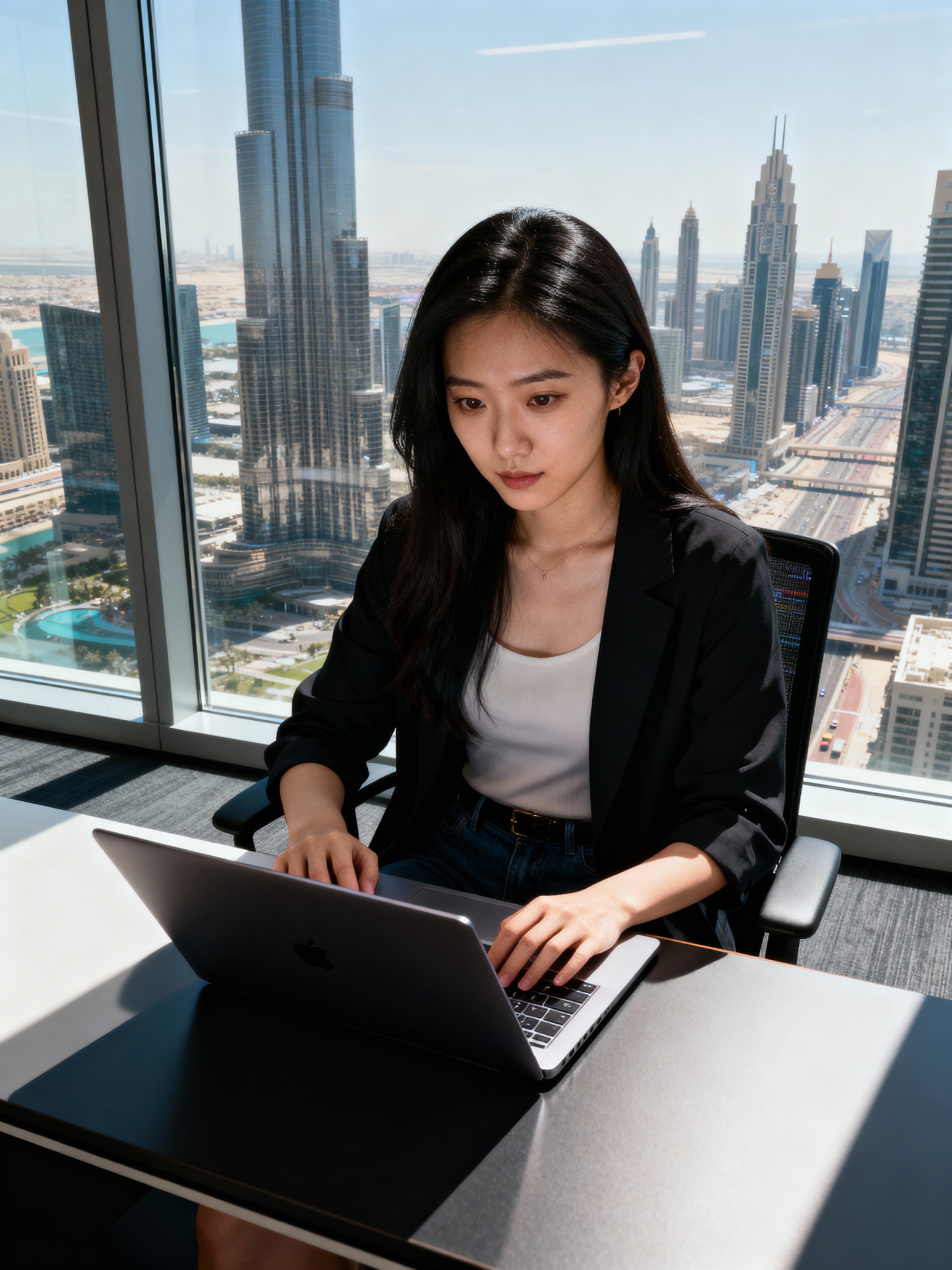 beautiful model model trading crypto on a laptop in a skyscraper office overlooking Dubai, wearing smart casual outfit