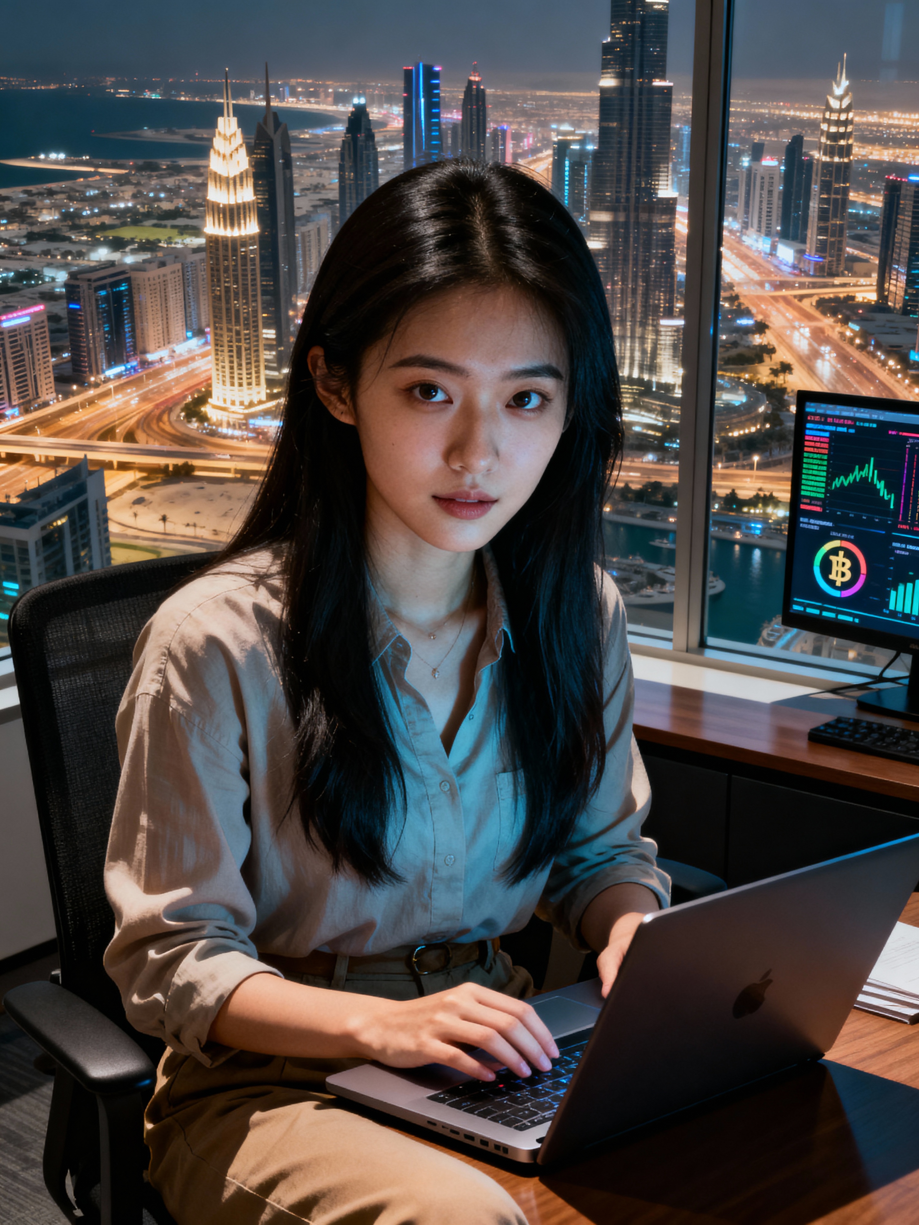 beautiful model model trading crypto on a laptop in a skyscraper office overlooking Dubai, wearing smart casual outfit