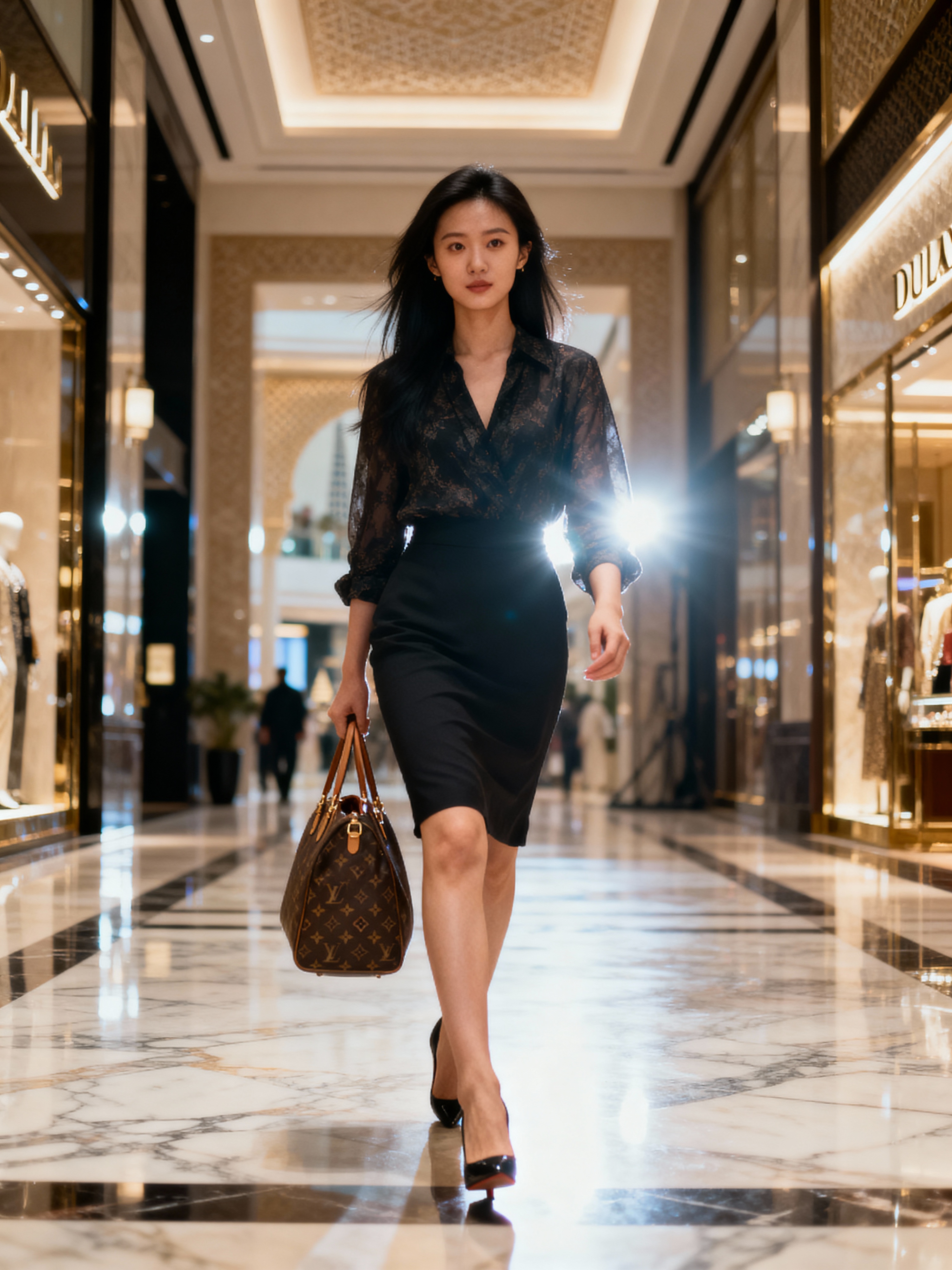 beautiful model model walking through a luxury mall in Dubai carrying designer bags, heels clicking on marble floor