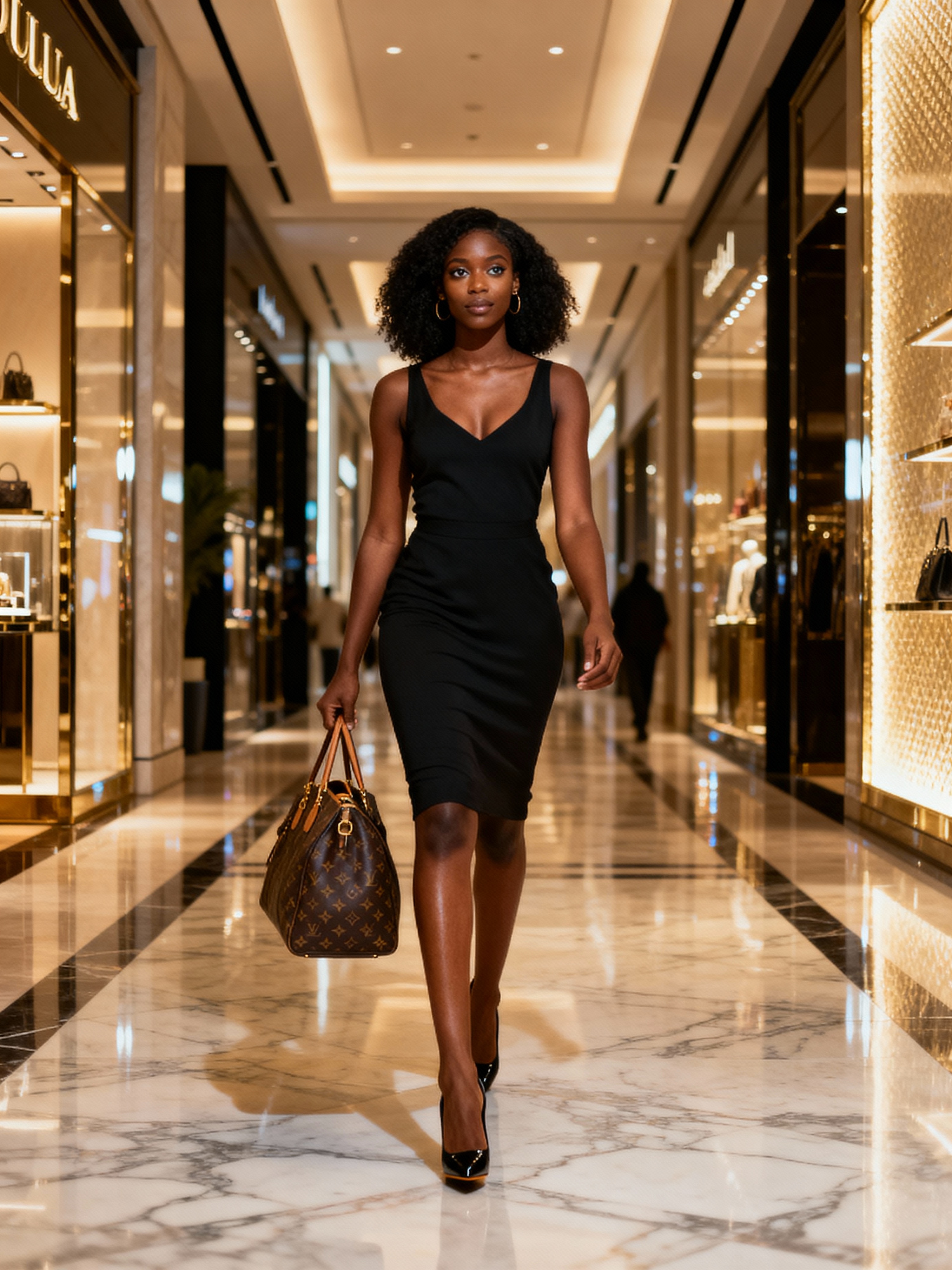 beautiful model model walking through a luxury mall in Dubai carrying designer bags, heels clicking on marble floor