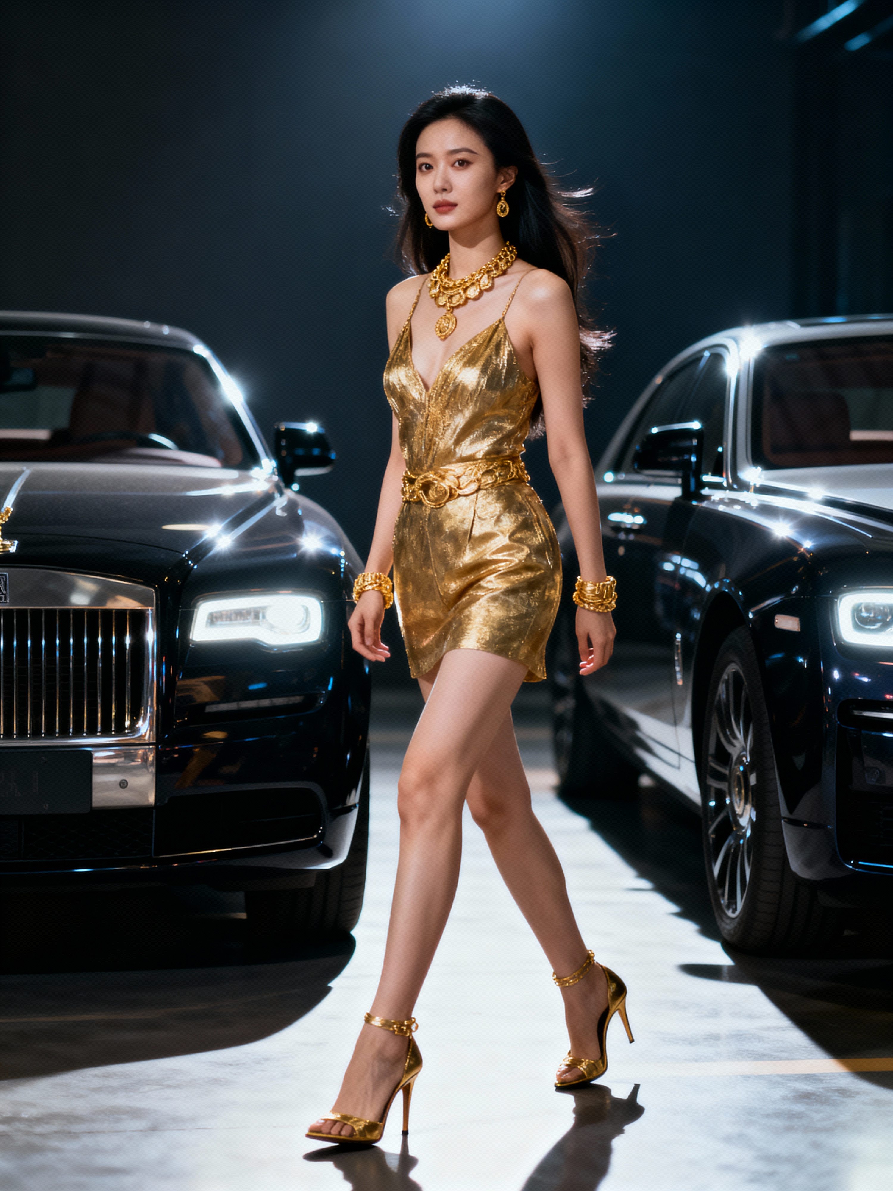 beautiful model model wearing gold jewelry and high heels walking past luxury cars in slow motion