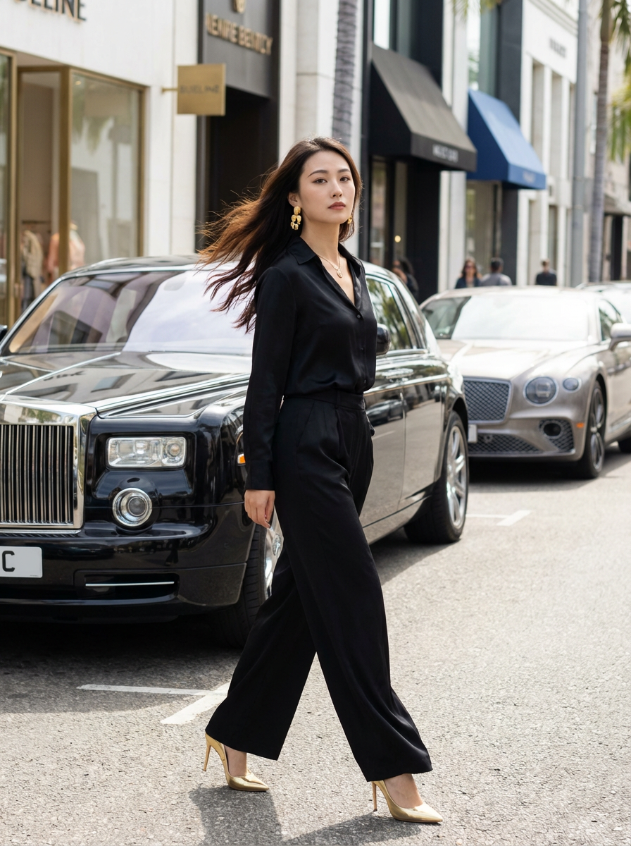 beautiful model model wearing gold jewelry and high heels walking past luxury cars in slow motion