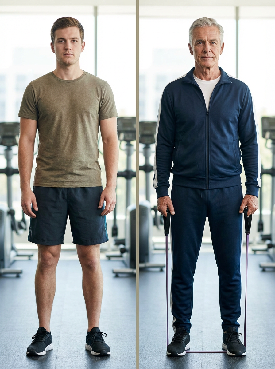 before and after comparison showing model young vs healthy and fit old, split screen effect