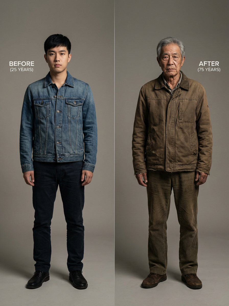 before and after comparison showing model young vs old, split screen effect, dramatic age transformation, time passage demonstration