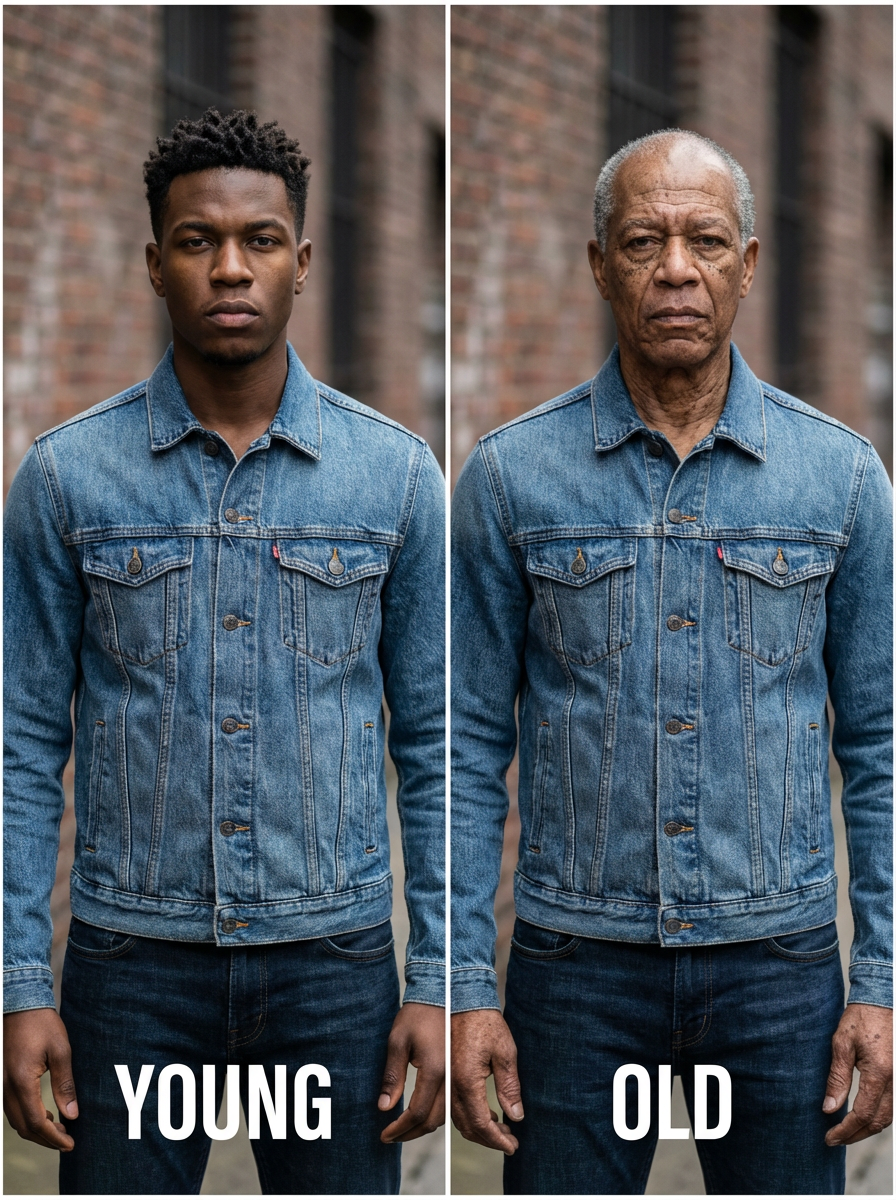 before and after comparison showing model young vs old, split screen effect, dramatic age transformation, time passage demonstration