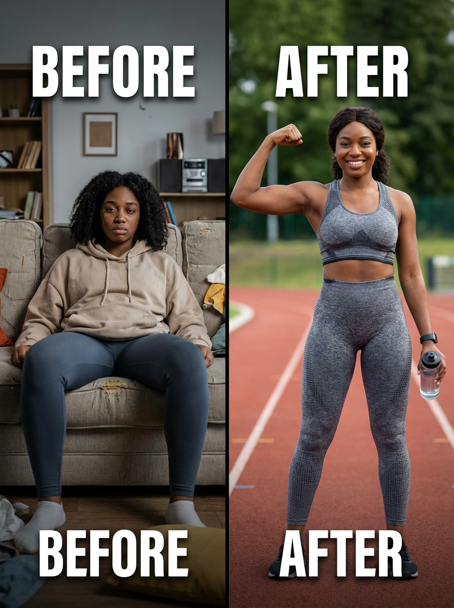 before and after comparison showing model young vs healthy and fit old, split screen effect