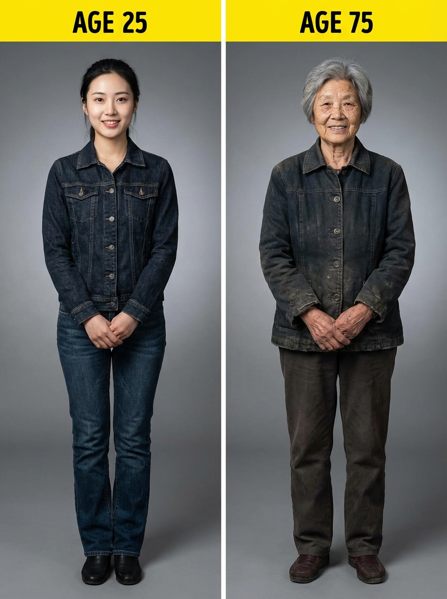 before and after comparison showing model young vs old, split screen effect, dramatic age transformation, time passage demonstration
