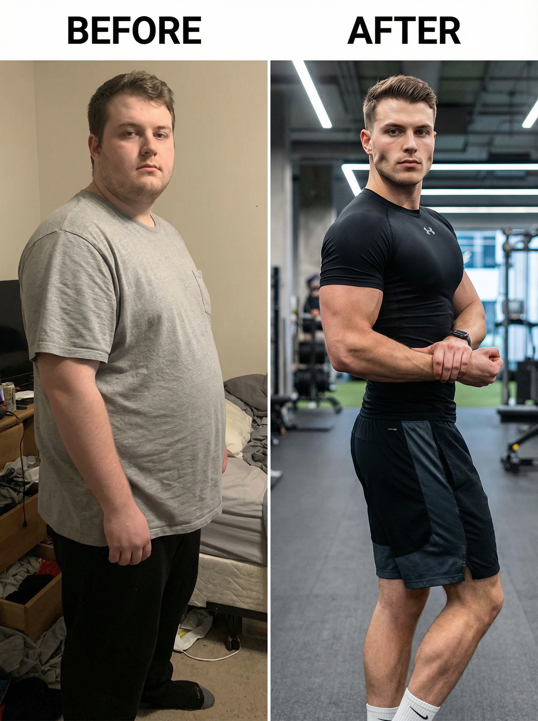 before and after photo of model. before he is oveweight and ugly. after he is looksmaxxing with defined jawline cheekbones fit masculine in compression top