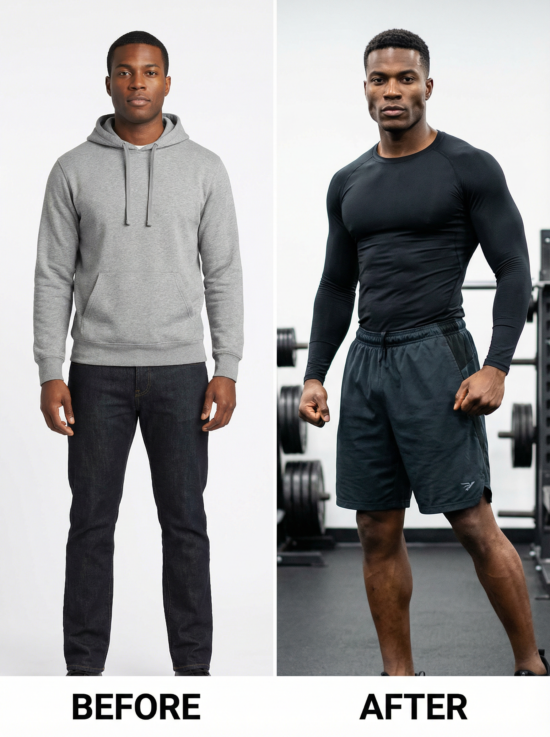 before and after photo of model. before use the reference photo. after is a new photo and he is looksmaxxing with defined jawline cheekbones fit masculine in compression top and gym shorts.