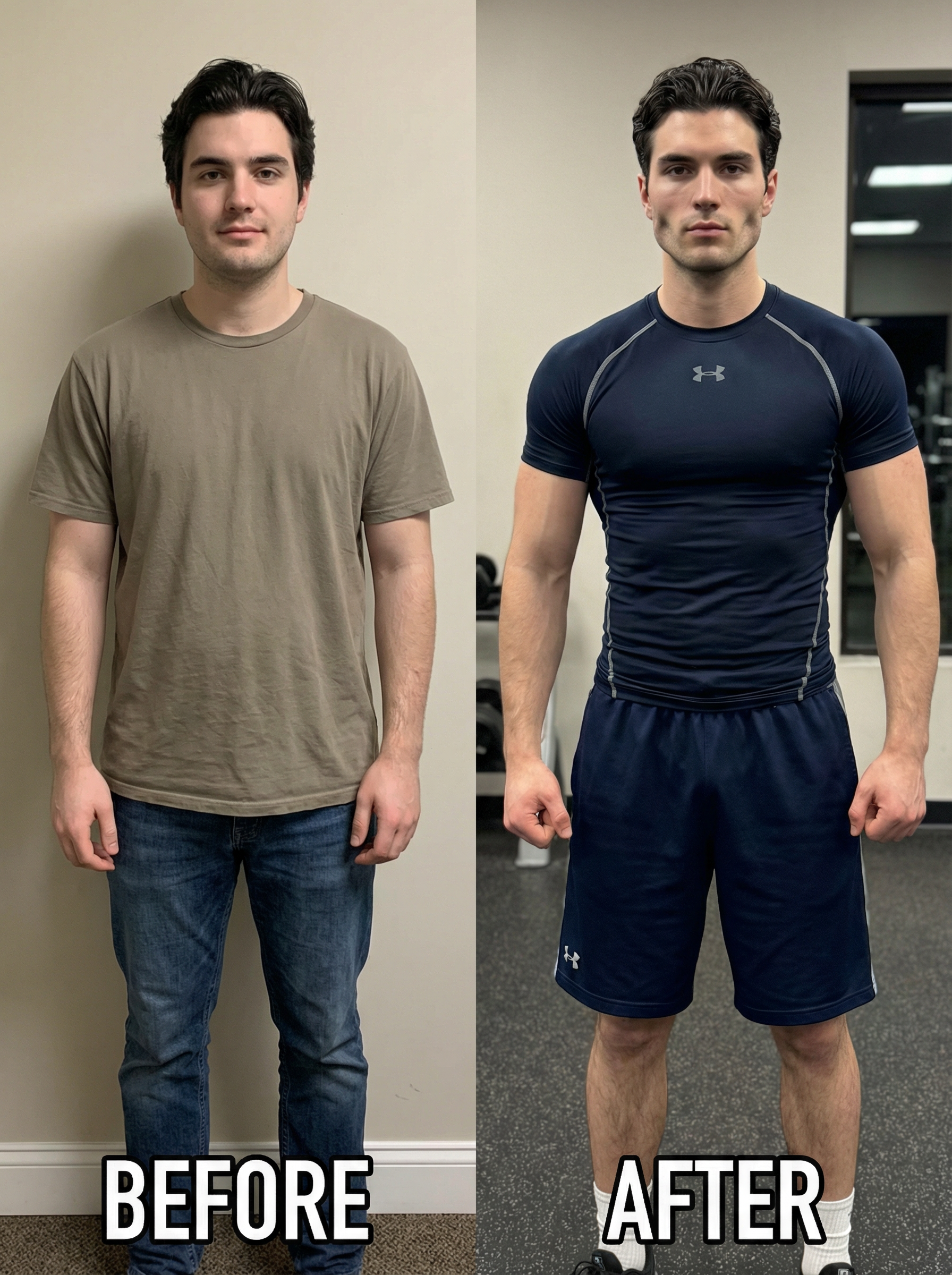 before and after photo of model. before use the reference photo. after is a new photo and he is looksmaxxing with defined jawline cheekbones fit masculine in compression top and gym shorts.