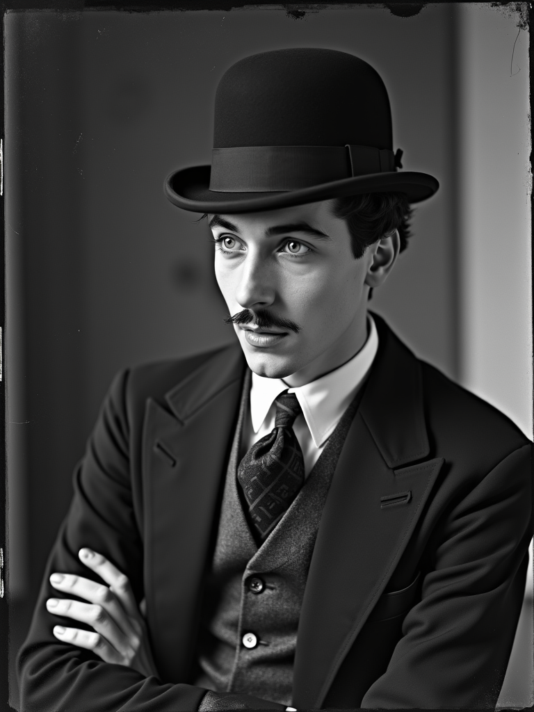 black and white 35mm film of model as a 1920s silent comedy actor in the style of Charlie Chaplin, wearing the iconic bowler hat and baggy suit, exaggerated comedic expression, slapstick pose, black and white with scratchy film texture, vintage movie set