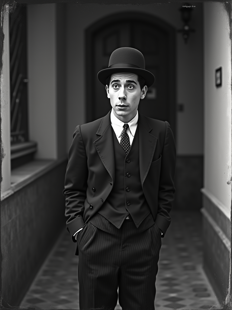 black and white 35mm film of model as a 1920s silent comedy actor in the style of Charlie Chaplin, wearing the iconic bowler hat and baggy suit, exaggerated comedic expression, slapstick pose, black and white with scratchy film texture, vintage movie set