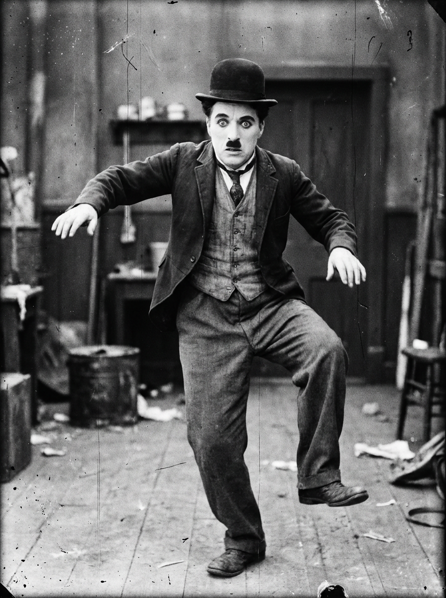 black and white 35mm film of model as a 1920s silent comedy actor in the style of Charlie Chaplin, wearing the iconic bowler hat and baggy suit, exaggerated comedic expression, slapstick pose, black and white with scratchy film texture, vintage movie set