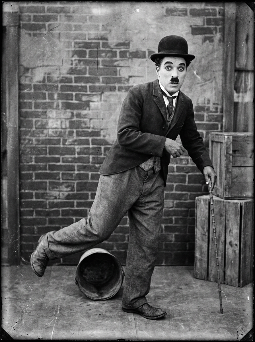black and white 35mm film of model as a 1920s silent comedy actor in the style of Charlie Chaplin, wearing the iconic bowler hat and baggy suit, exaggerated comedic expression, slapstick pose, black and white with scratchy film texture, vintage movie set