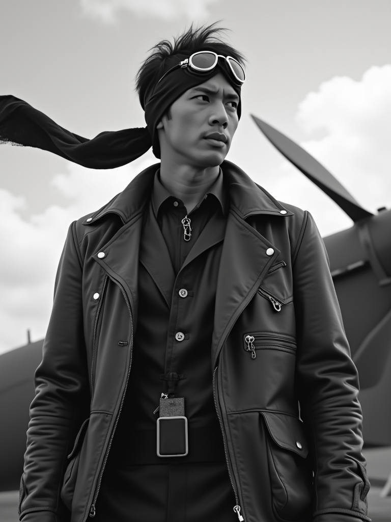 black and white 35mm film of model as a 1920s silent film aviator wearing leather flight jacket and goggles, dramatic wind-blown scarf, triumphant expression, airplane propeller visible in frame, high-contrast black and white, cloudy sky backdrop
