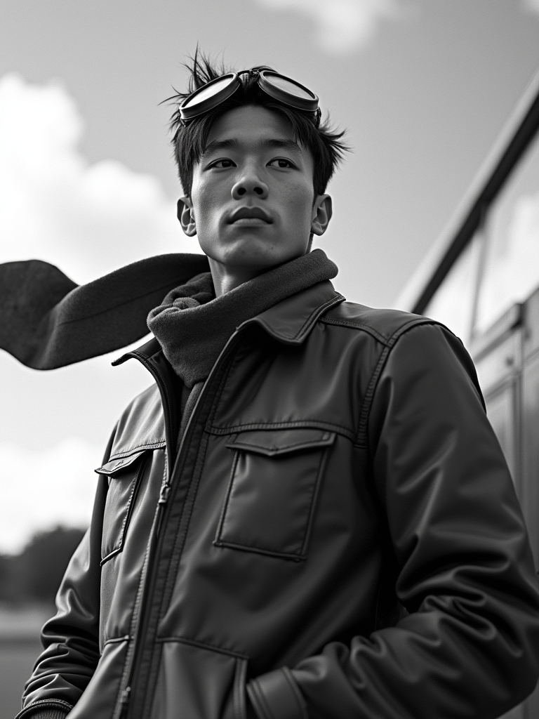 black and white 35mm film of model as a 1920s silent film aviator wearing leather flight jacket and goggles, dramatic wind-blown scarf, triumphant expression, airplane propeller visible in frame, high-contrast black and white, cloudy sky backdrop
